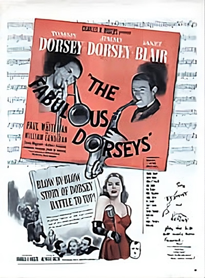 The Fabulous Dorseys (1947) is a musical biopic about brothers Tommy and Jimmy Dorsey, chronicling their journey from their Pennsylvania coal-mining childhood, through their rise to big band fame, their fiery on-stage feud leading to separate successful orchestras, and their eventual reunion, all while showcasing their hit songs and featuring cameos from other music stars. The fictionalized story highlights their musical talent but also their bickering tempers, with childhood friend Janie (Janet Blair) acting as a peacemaker, and includes a romantic subplot with pianist Bob Burton (William Lundigan).