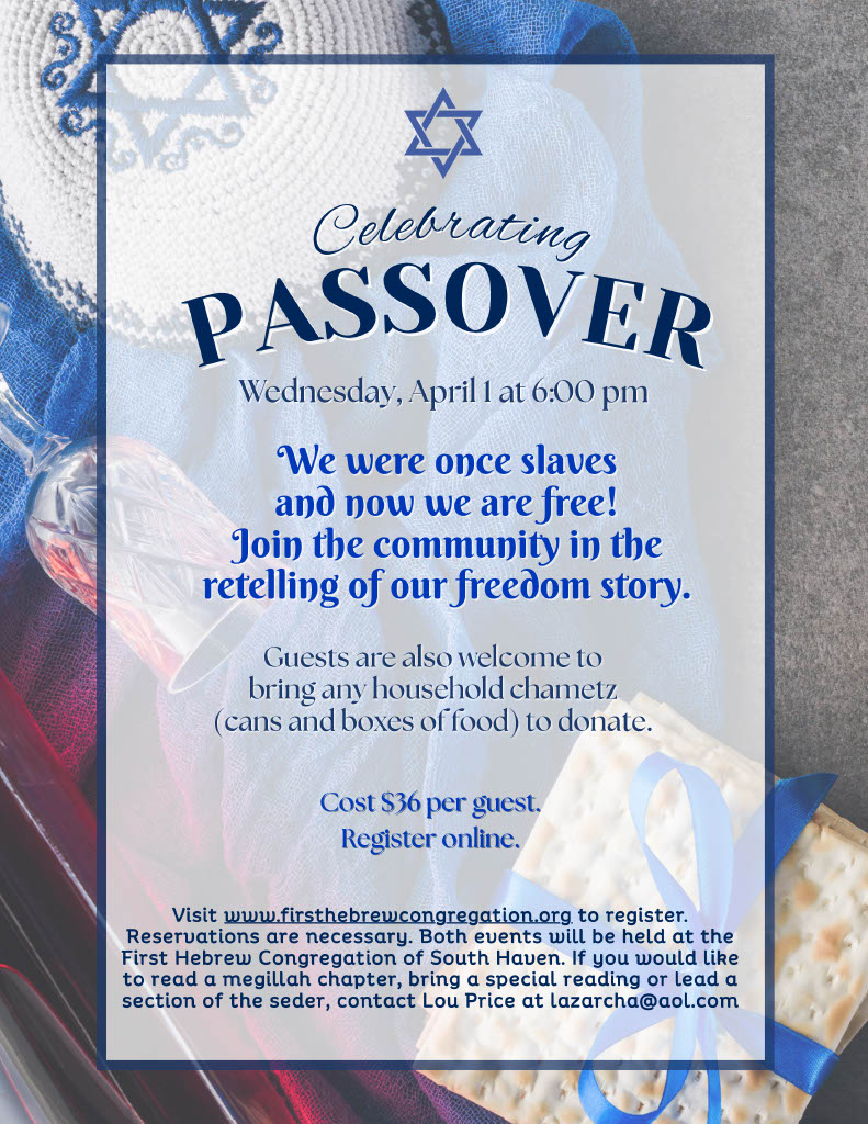 We were once slaves, and now we are free! Join First Hebrew Congregation of South Haven in retelling our freedom story at our Passover Seder scheduled for 6:00 pm, Wednesday, April 1.